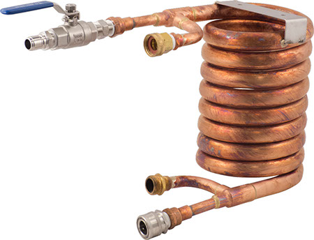 While our counterflow wort chiller from MoreBeer! is already one of our best selling items, we made it even more efficient and effective with our all-inclusive Counterflow Wort Chiller Assembly kit. This complete kit includes everything that you need to chill your wort to the perfect temperature before it enters the fermenter, plus all of the essential parts for assembling it and attaching it to your existing brew kit.,The Counterflow Wort Chiller Assembly features quick disconnects on both the wort in and out, as well as a ball valve on the wort out to enable you to control the flow rate while cooling. This ball valve is especially important because it allows the wort more contact time against the water, meaning colder wort once it reaches your fermenter. With high quality copper piping and stainless steel fittings, this wort chiller assembly is truly an investment piece that will last for years to come. ,Inlet: female quick disconnect, outlet: male quick disconnect,,